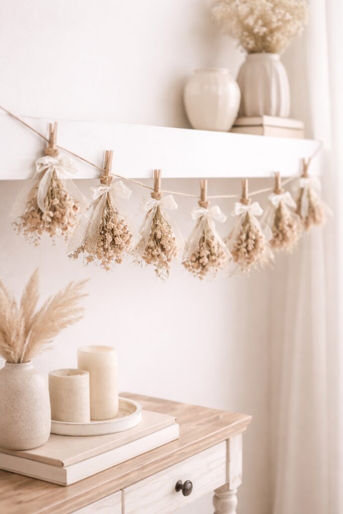 If you love that soft, romantic, slightly vintage energy, this dried flower and lace garland is going to steal your heart. It feels delicate and feminine without being fussy, and it instantly makes a small space look styled rather than crowded.