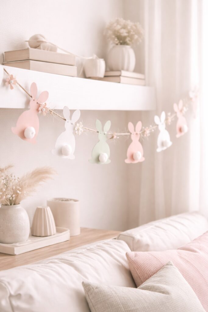 If you love a cute seasonal touch but you also love a tight budget, this one is about to be your favourite. A paper flower and bunny silhouette garland is playful, lightweight, and surprisingly chic when you keep the colour palette refined.