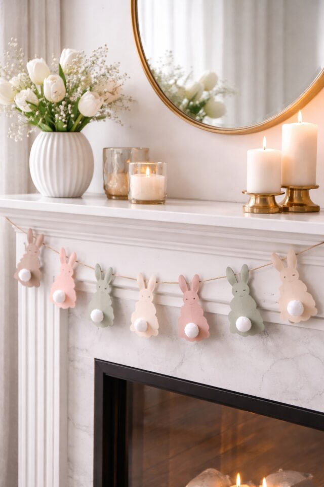 A mini Easter bunny garland instantly adds that soft seasonal touch without overwhelming your space. It works beautifully across a mantel, draped over open shelving, styled along a mirror, or even across balcony doors if you are leaning into spring energy properly.