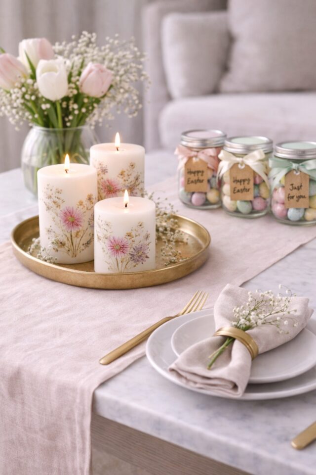 Layer your new runner with pressed flower candles, fresh tulips, and your Easter gift jars from earlier. Add neutral plates, linen napkins, and a few gold accents for that polished finish.