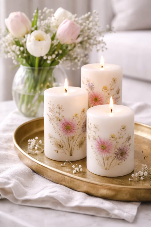 Pressed flower candles are the definition of intentional living meets seasonal styling. They look delicate and elevated, yet they are surprisingly simple to create. Perfect for Easter brunch tables, bedside styling, or adding a subtle spring refresh to your living room.