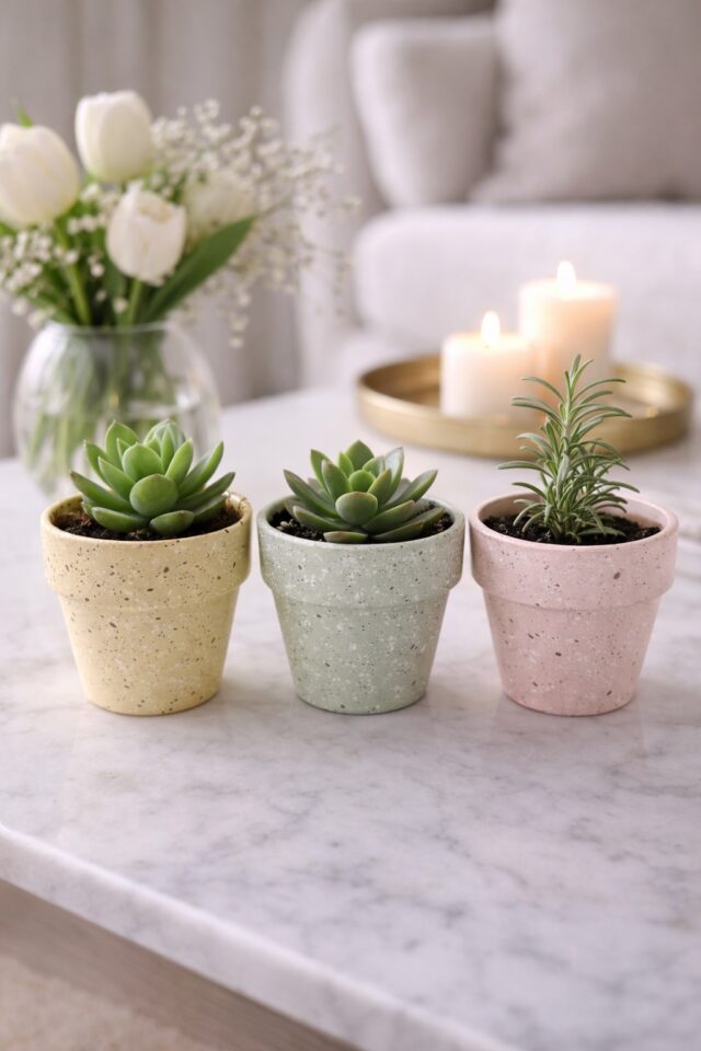 Group three planters together on a kitchen windowsill, balcony shelf, or coffee table tray. Mix slightly different pastel shades for that curated but effortless look.