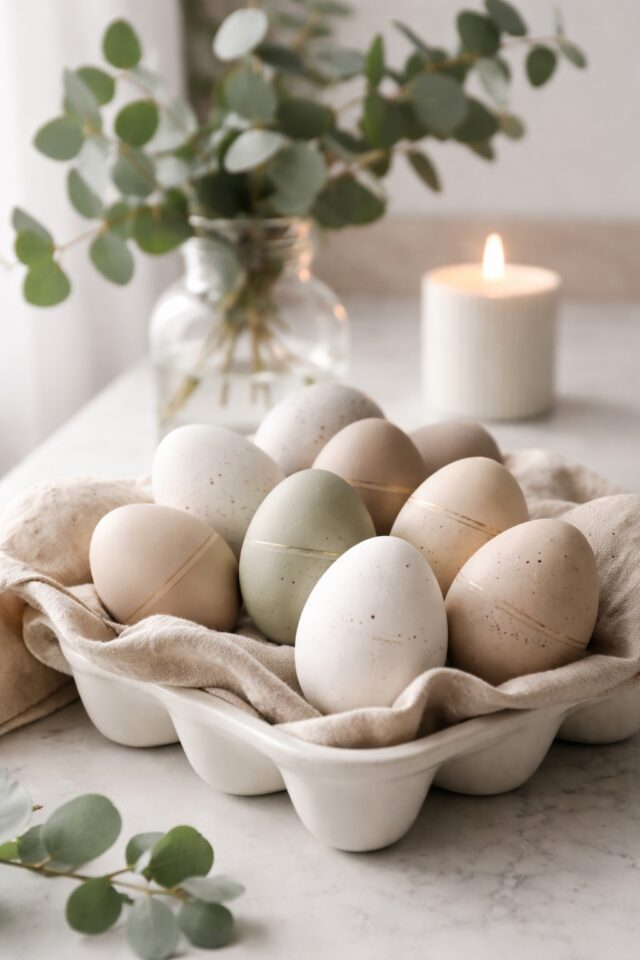 Place your finished eggs in a ceramic tray or shallow bowl lined with crumpled linen. Add a few sprigs of eucalyptus or olive branches for that effortless, editorial look. This is the kind of Easter decor that whispers taste instead of shouting theme.