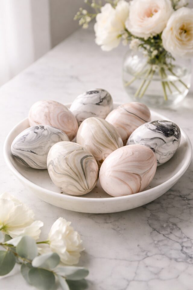 If you love a high end kitchen aesthetic and anything that looks like it belongs on a Carrara countertop, marble effect Easter eggs are your girl. They feel artistic, modern, and slightly dramatic without trying too hard.
