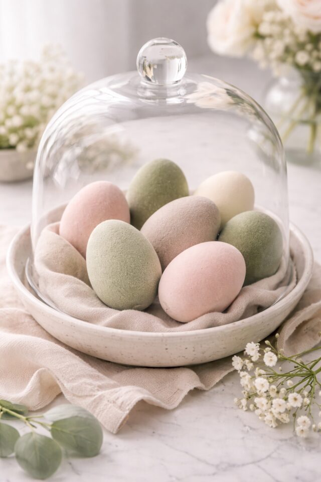 Display your velvet eggs under a glass cloche or in a shallow bowl layered with soft linen. Keep the colour palette muted and cohesive so the texture becomes the hero.
