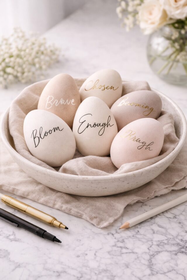 If you love meaningful details and intentional decor, calligraphy eggs are where creativity meets confidence. These are subtle, personal, and just a little bit powerful. Instead of patterns, you are adding words that reflect who you are and what you are stepping into this season.