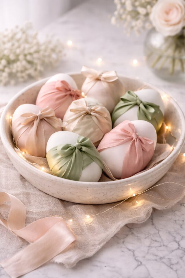 If you adore feminine details and timeless textures, silk ribbon wrapped eggs are pure elegance. They feel delicate, romantic, and beautifully styled without needing paint or patterns.