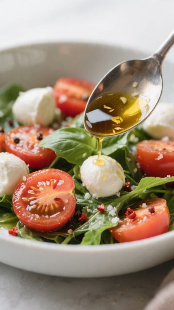 • Dress and finish: Spoon the dressing over the salad. If using balsamic glaze instead of vinegar, drizzle it lightly over the top and finish with olive oil. Add a final pinch of flaky salt and pepper.