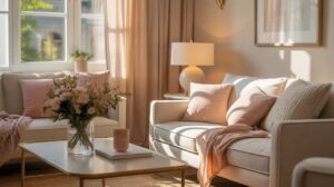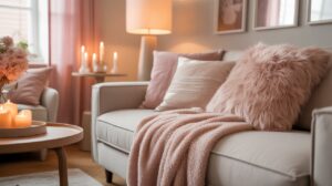 Cozy living room with plumped cushions, lit candle, and tidy surfaces during a calm weekly home reset.