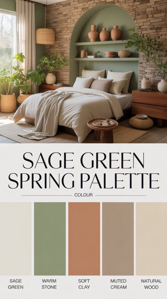This palette is for those moments when you want your home to feel like a deep breath. Sage green has that magical ability to calm the nervous system while still feeling fresh and alive, which makes it perfect for spring. Paired with soft earth tones, it creates a space that feels balanced, nurturing, and quietly beautiful.