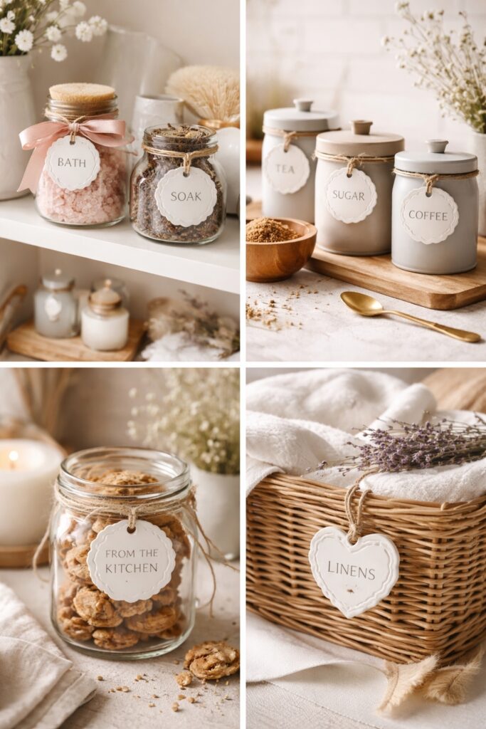 Start with your bathroom. Tie them onto glass jars filled with bath salts, dried flowers, or bath soaks. Suddenly your shelf goes from functional to spa energy in about two seconds.