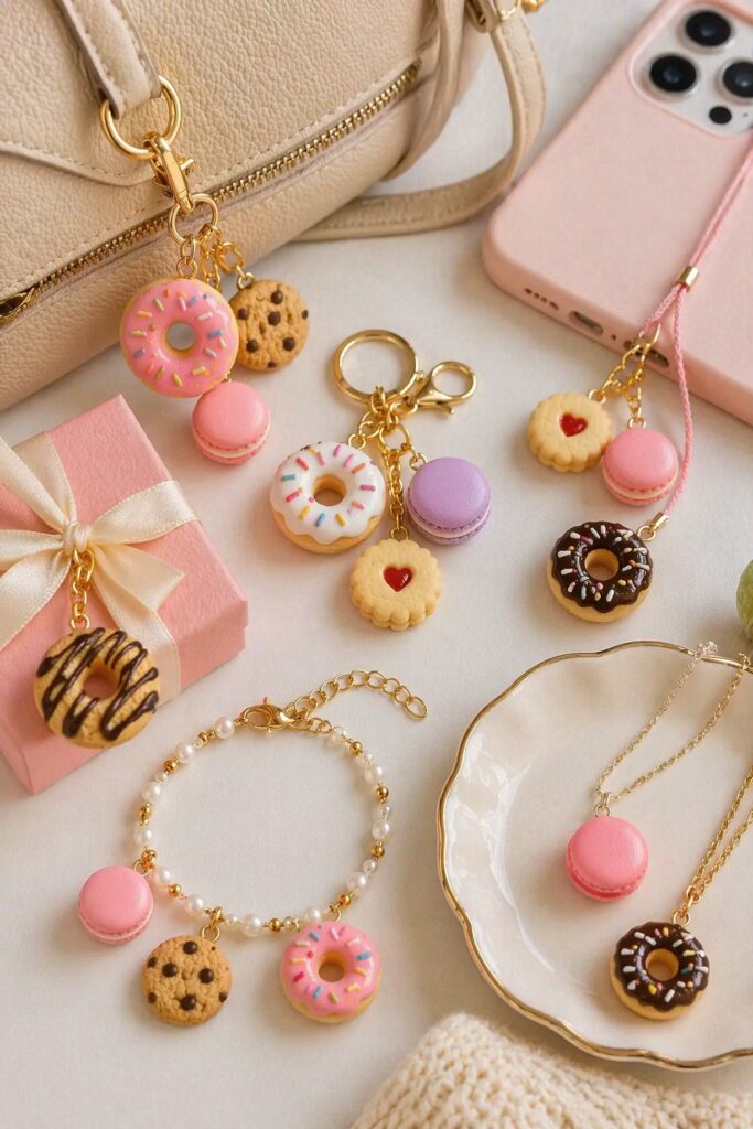 Next, mix a few different charms together. A small collection of 2 to 4 pieces works perfectly. For example, a donut, a macaron, and a cookie instantly create that “mini dessert box” feel without being overwhelming.