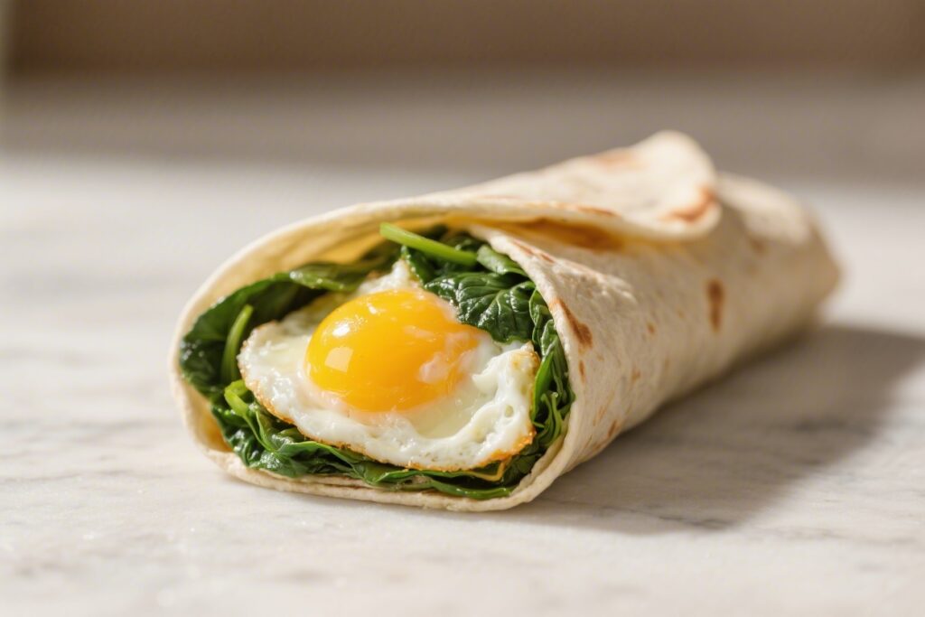 This wrap is what you make when you want something warm, filling, and fast. It’s got soft scrambled eggs, wilted spinach, a little cheese, and a creamy swipe of sauce—all tucked into a toasty tortilla. It tastes like a diner breakfast but eats like a weekday lunch.