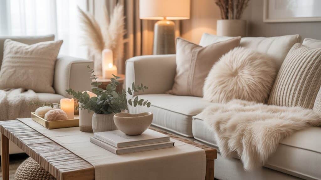 Think chunky knits, boucle cushions, velvet accents, and faux fur throws. Mixing textures adds depth and warmth, even in the most neutral spaces. A simple throw over the sofa, plush cushions on the bed, or a rug layered over hard floors can completely change how a room feels.